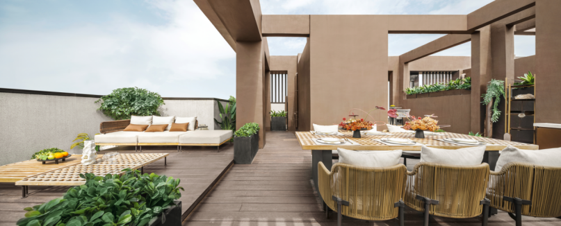 不过,上叠最大的亮点,应该属于屋顶花园。锦江大院通过优化屋顶空间布局和外墙设计,减少了与其他户的对视的同时,也让这个约85㎡的屋顶花园,具备被打造为半室内空间的资质。