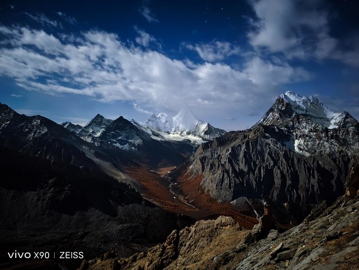 在这组低照度雪山主题的画面中,我们不难发现,vivo X90更多地保留了画面中的色彩细节:无论远处主峰的明暗纹理、高处云层的色彩质感、谷地中暗红色的植被还是近处山石的色彩和质感等细节,vivo X90的表现都堪称完美——按vivo官方的说法,这都得益于其自研的VCS仿生光谱技术。该技术从根本上解决了CMOS色彩损失的问题。这项技术有望成为移动影像行业的下一个进化点,让CMOS的光谱响应从提升「进光量」的时代跨入提升「进光量质」的时代。