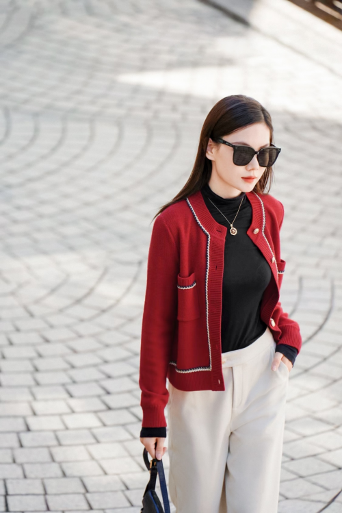 扬子羊毛衫,领子的高度、夹位同样也做了五六轮的调整,甚至连袖口、领口的松紧程度都调整了十几次。太紧怕小气,太松则显拖沓,从春天调到秋天,终于调到满意。