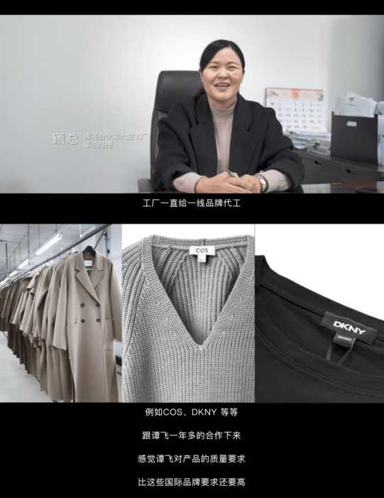 谭飞女装的产品都是跟一线工厂合作,很多工厂都也是COS、DKNY、THEORY等轻奢品牌的供应商,甚至有供应商说谭飞女装的质量要求比那些轻奢品牌还要严格。