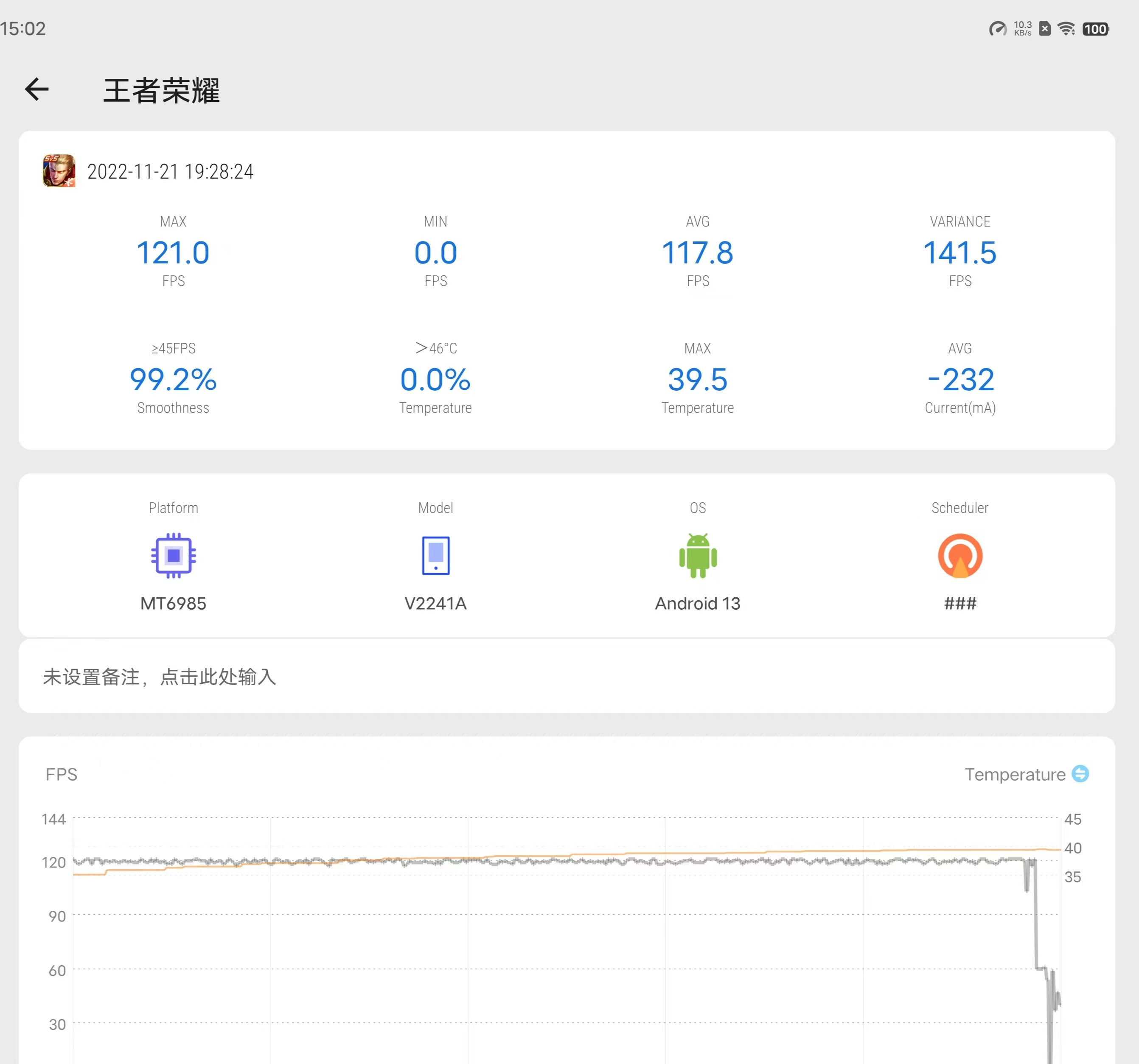 再来看看实际游戏表现,先是《王者荣耀》,目前vivo X90已经完美适配了各家主流游戏的高帧率模式,我们将画质调至最高,帧率设定为120FPS。在20分钟的游戏过程中,vivo X90的表现十分稳定,测试曲线十分平滑,在游戏过程中没有卡顿的现象,表现很不错。