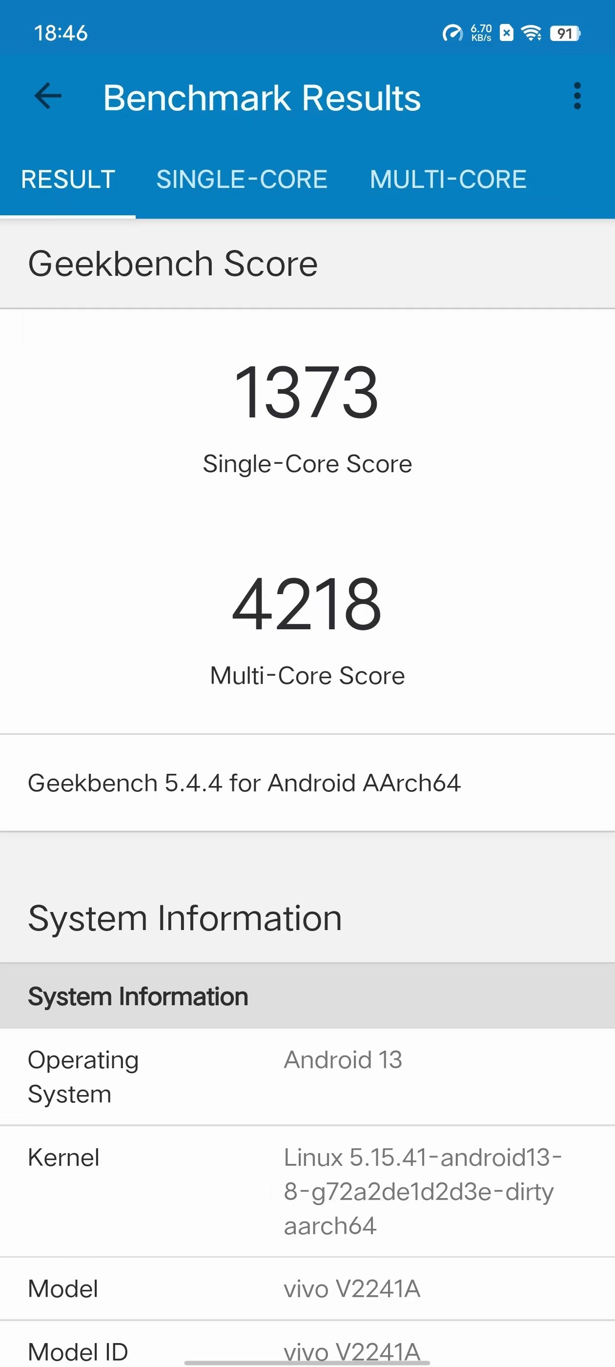 CPU方面,我们采用Geekbench 5进行测试,vivo X90的单核成绩达到了1373分,多核成绩达到了4218分。作为对比,在同样的测试环境下,搭载了天玑9000处理器的旗舰手机1222分,多核成绩为3868分,尽管单核成绩提升一般,但是多核成绩提升还是比较明显的。