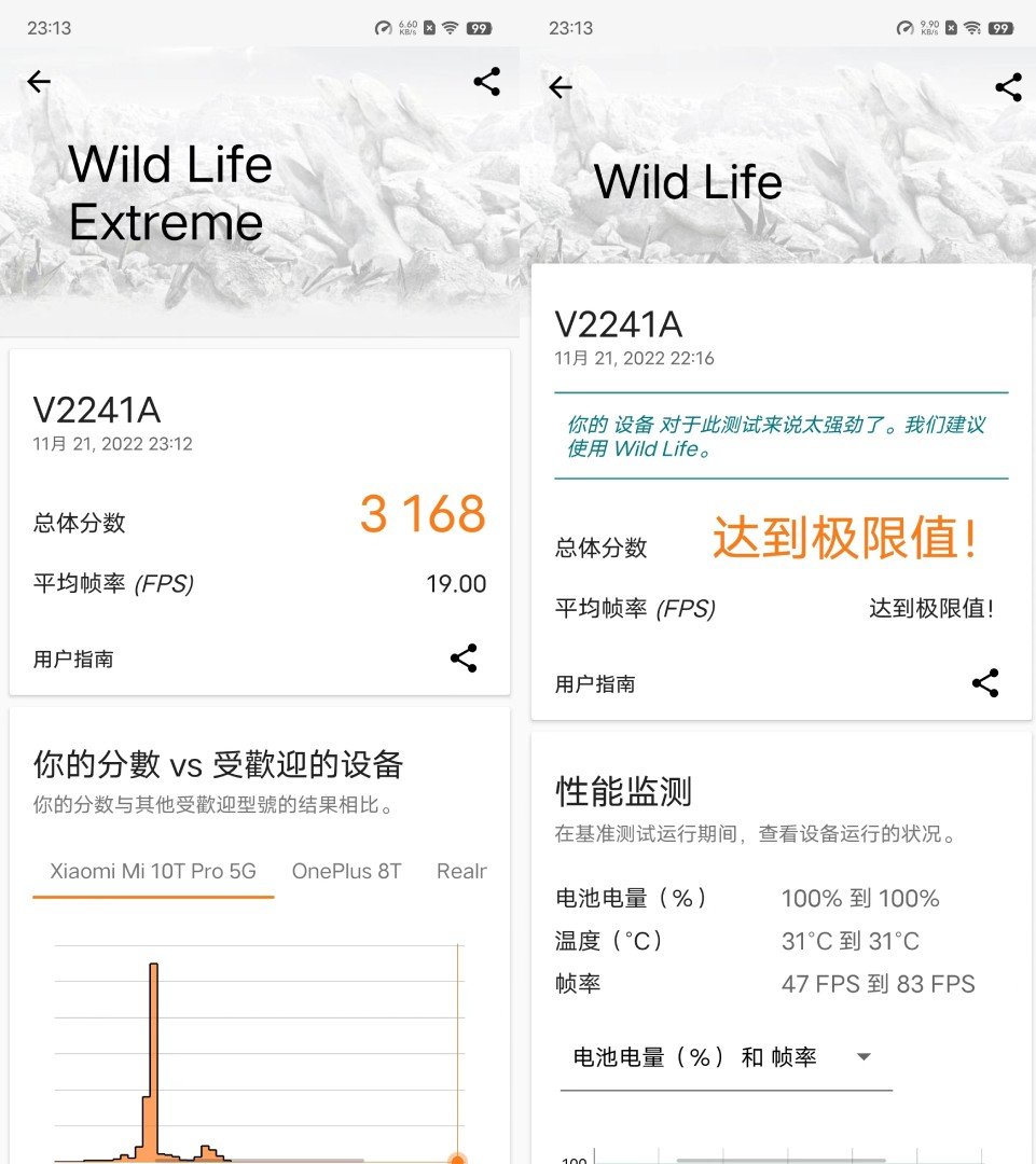 GPU方面,我们使用3DMark进行测试。在Wild Life测试中,vivo X90居然超出了这项测试能够达到的极限值,而在更加苛刻的Wild Life Exterme测试(2K渲染)中,vivo X90跑出了3168分的好成绩,性能表现远超前代旗舰平台,和苹果A15相比也不落下风。