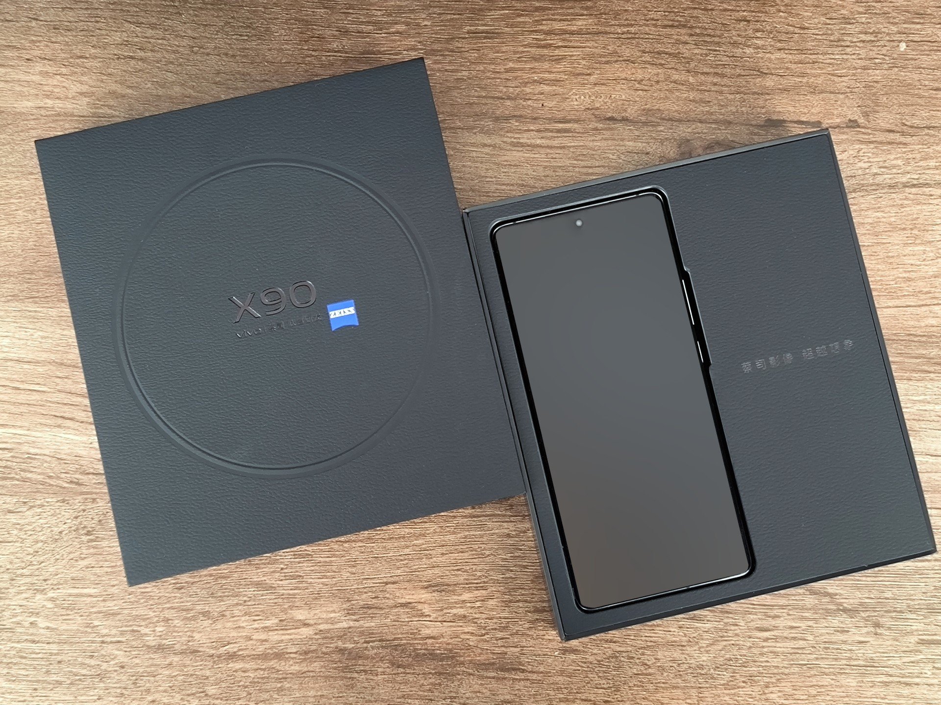 为了满足用户的个性化需求,vivo X90提供了三种配色、两种材质供用户选择,其中黑色、蓝色都是AG磨砂玻璃材质,而“华夏红”则采用了荔枝纹素皮材质。我们手上这款产品就是“华夏红”版,个人认为略带胭脂味道的淡红色相当吸睛,倒是素皮材质的手感如何就因人而异了。