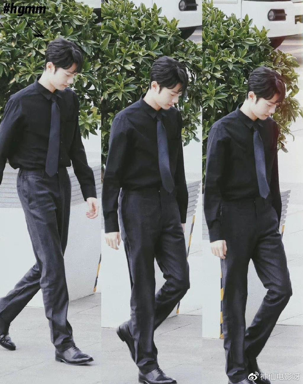 他身着黑衬衫,系着黑领带,体态挺拔。