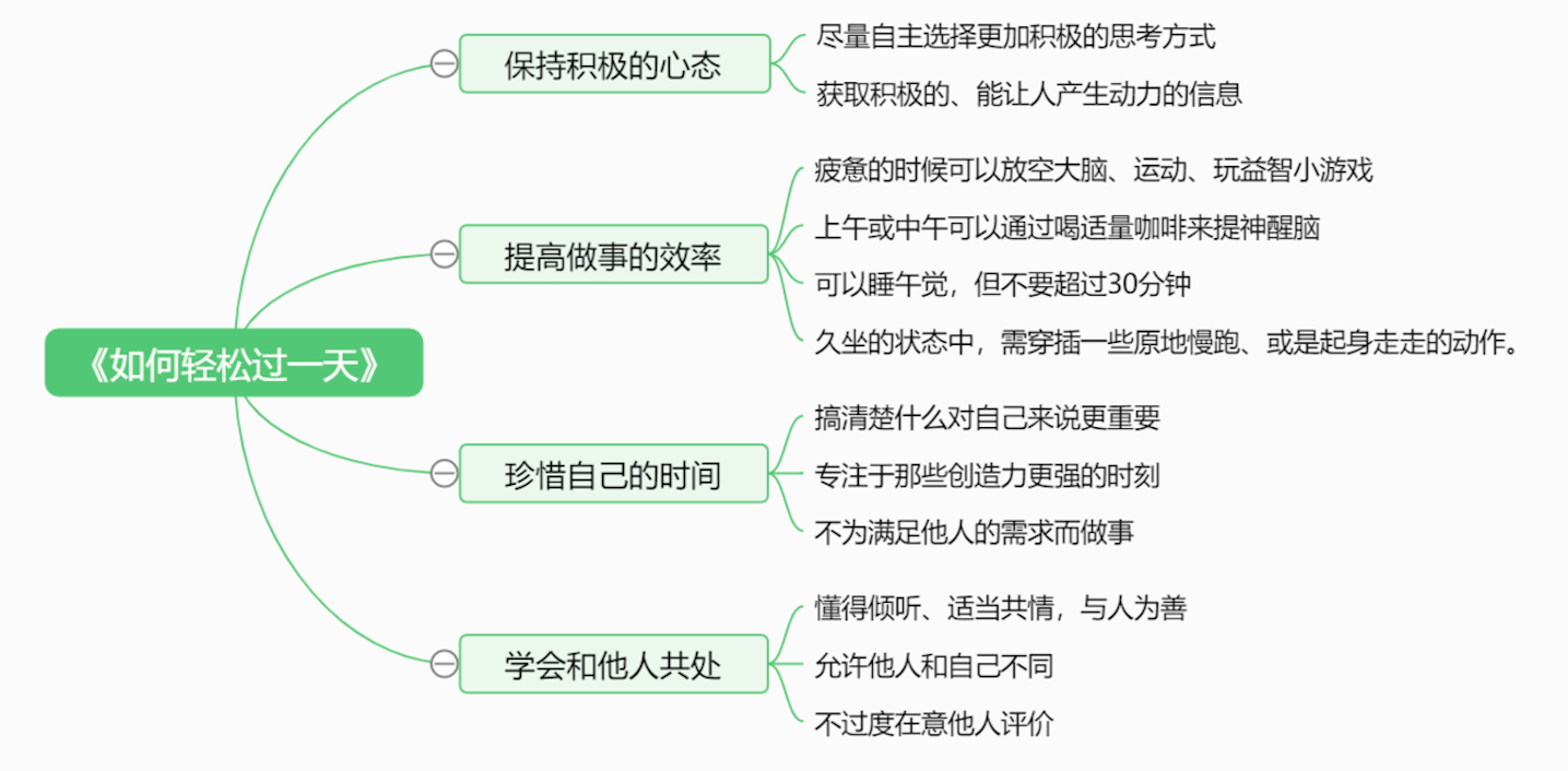 所以我最终只是从书中整理出非常少的一部分方法,另外,每一段的小结部分都是我根据个人经验以及自己从大量书中吸收的信息作出的总结,希望这篇笔记真的能够为大家放松心情、减轻压力、提升效率、提升幸福感提供一些思路吧。