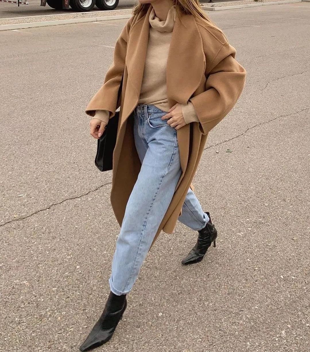 喜欢一身黑的酷girl也可以在配色上面玩出高级范儿,一个焦糖色的云朵包搞定!