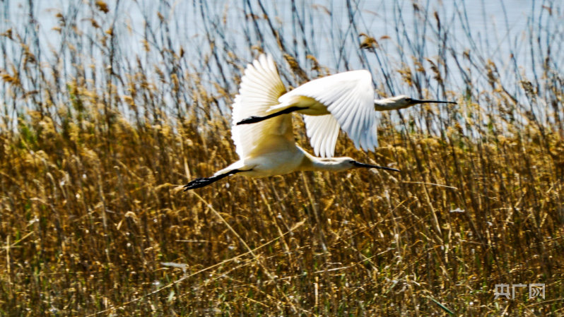 一对白琵鹭在湿地展翅飞翔 (央广网发 白敖敏 摄)