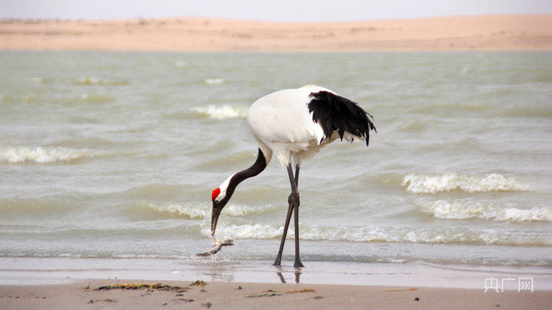在水边捕食小鱼的丹顶鹤 (央广网发 白敖敏 摄)