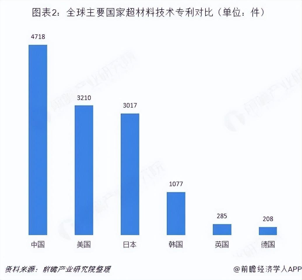 目前,全球超材料技术专利主要集中于中国、美国、日本、韩国、英国、德国。其中,全球拥有超材料技术专利最多的国家是中国,共拥有4718件专利。其次为美国,拥有3210件超材料技术专利。此后是日本拥有3017件专利,以及韩国拥有1077件专利。