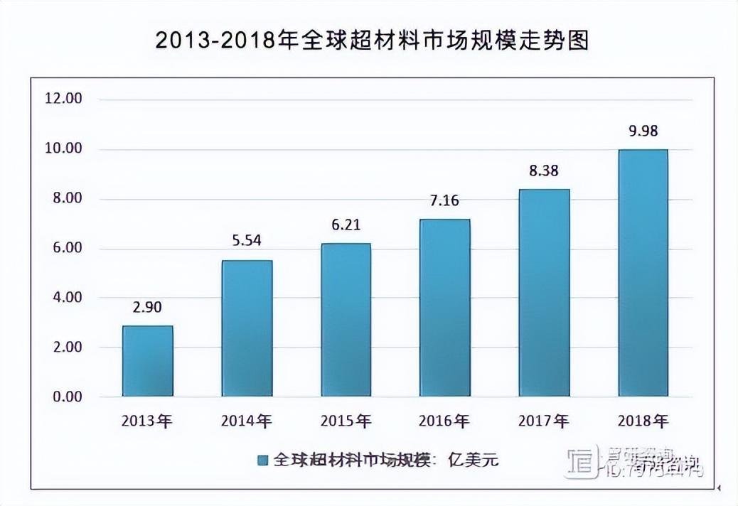 2018年,全球超材料市场规模约为9.98亿美元,较2017年的8.38亿美元增长了19.10%。更有相关人士指出未来几年,全球的超材料复合增长率将超过20%。