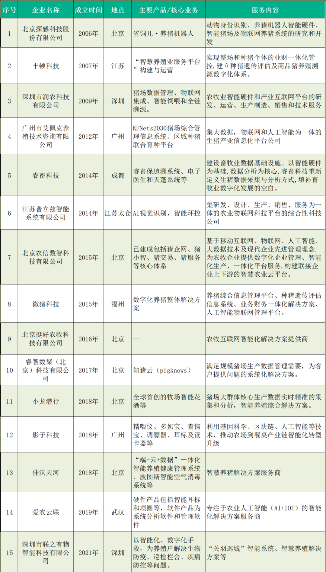 图:我国部分从事生猪数智化的企业(按企业成立时间排序),数据来源:据公开资料收集