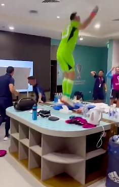 而作为球队取胜的头号功臣,梅西也罕见放飞自我。更衣室内,梅西半身赤膊,与队友们一起高歌。而作为更衣室开心果的门神马丁内斯,则跳到了更衣室中央的桌子上,他挥舞着毛巾跳个不停。由于大马丁身高1米95,不太敢发力跳跃碰到天花板的他,一副想疯狂庆祝却又不得不小心谨慎的表情,让人看得忍俊不禁。