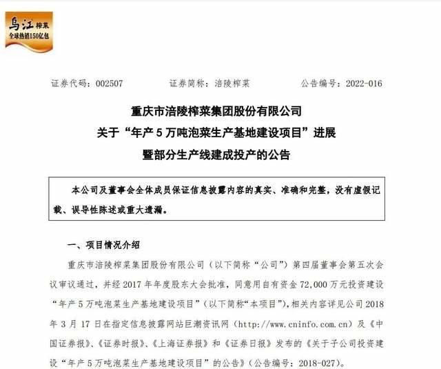 值得一提的是,在11月21日,涪陵榨菜发布公告称,由于近期重庆市疫情防控形势严峻,涪陵榨菜涪陵生产基地在产品生产、物流运输等方面受到不利影响,该基地主要生产厂已于近日实施停产,公司已经采取一系列措施积极应对,具体复产时间根据疫情防控情况确定。