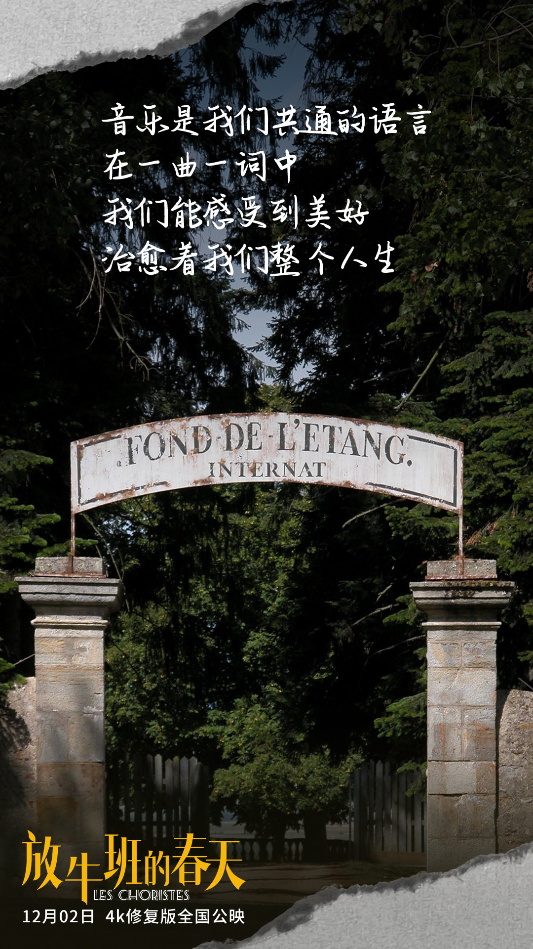 电影《放牛班的春天》由法国盖拉特电影公司出品,中国电影集团公司进口,中国电影股份有限公司译制,中国电影股份有限公司发行,北京环鹰时代文化传媒有限公司协助推广。电影《放牛班的春天》4k高清修复版,12月02日登陆国内院线,敬请期待。
