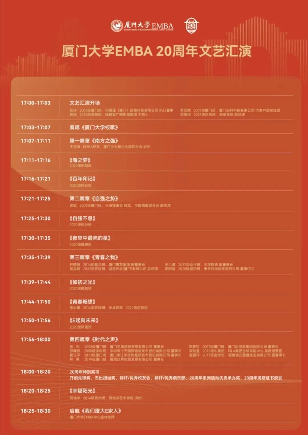 二十年我们勠力同心,在芙蓉湖留下了无数奋斗的身影。二十年我们携手同行,见证了经济腾飞,也实现了自身的成长、壮大。弦歌不辍,薪火相传,自强不息的厦大EMBA学子,将以大爱无疆的情怀,站在新历史节点下,坚持校训精神,向着未来全新出发!