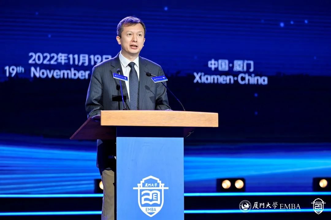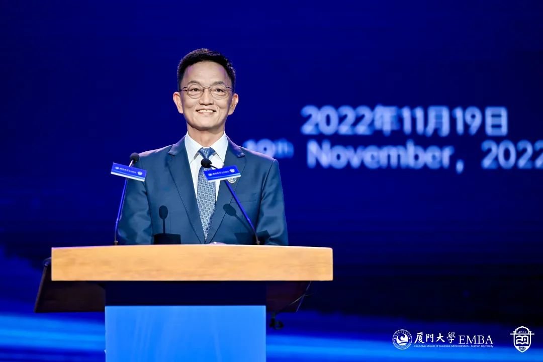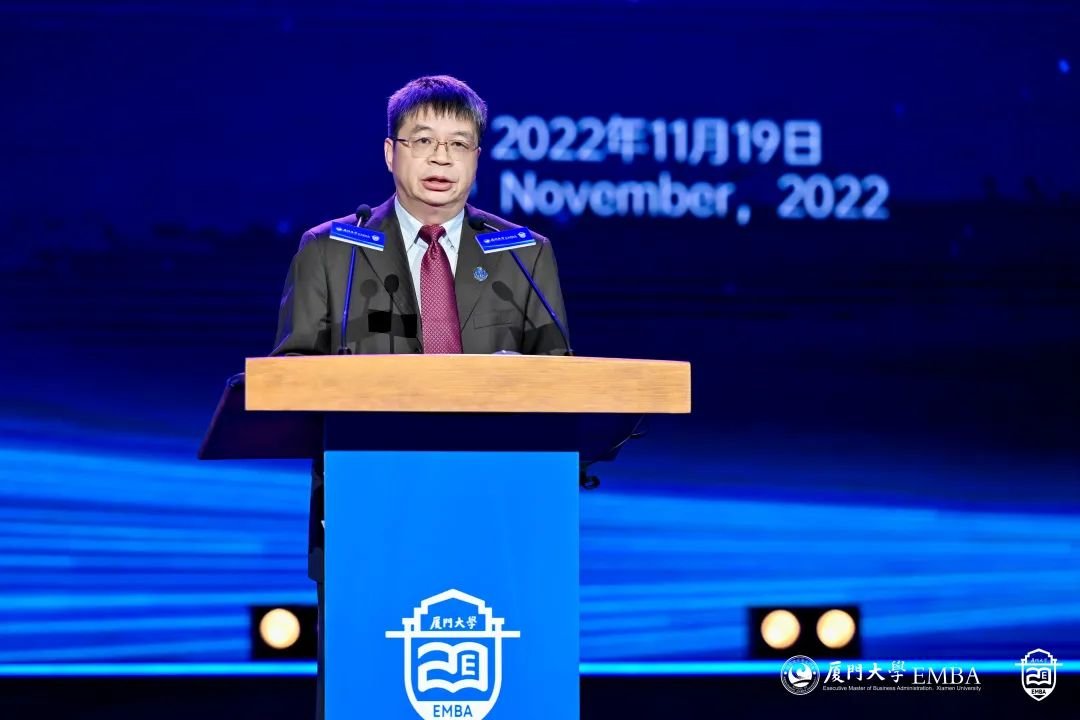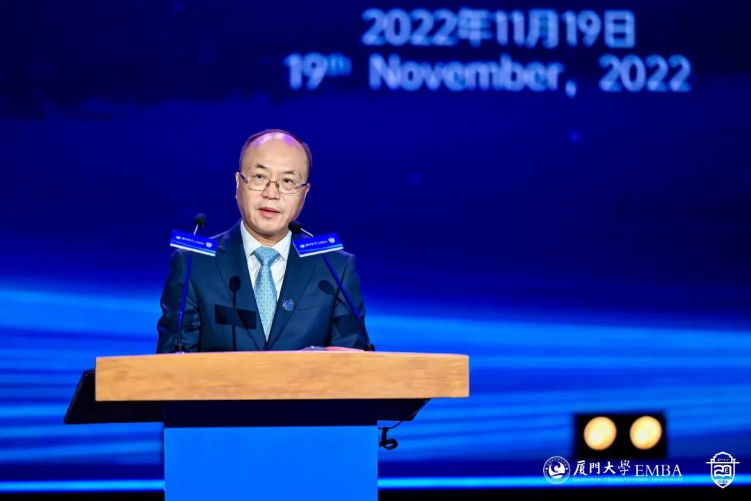 校长张宗益教授代表学校致辞。他指出,EMBA20周年发展大会是我校EMBA教育的一件大事和喜事,也是学校和管院的一次要事和盛会。20年来,我校EMBA根植厦大百年商科优良传统和深厚学术积淀,依托综合性大学优势,先后培养了近9000位优秀的企业家和高层次管理人才,学员满意度连续17年蝉联全国第一,被誉为中国名校EMBA“五朵金花”之一。一大批企业在我校EMBA校友的领导下,奋斗在国家经济建设主战场,积极参与全球化竞争,发挥着举足轻重的作用。EMBA校友们弘扬和践行嘉庚精神,积极承担社会责任,关心母校发展。他希望,厦大EMBA教育以党的二十大精神为指引,赓续我校百年商科的优良办学传统,坚守创办初心,牢记承担的历史和时代使命,进一步深化对管理实践的规律性认识,着力打造具有中国特色、厦大风格的EMBA教育体系,切实培养企业家和高级管理者解决复杂现实问题的思维方式和实践能力,让EMBA教育真正服务企业发展需要,让厦大EMBA学员成为引领商业模式创新、产业结构升级、时代发展变革的商海领航人。