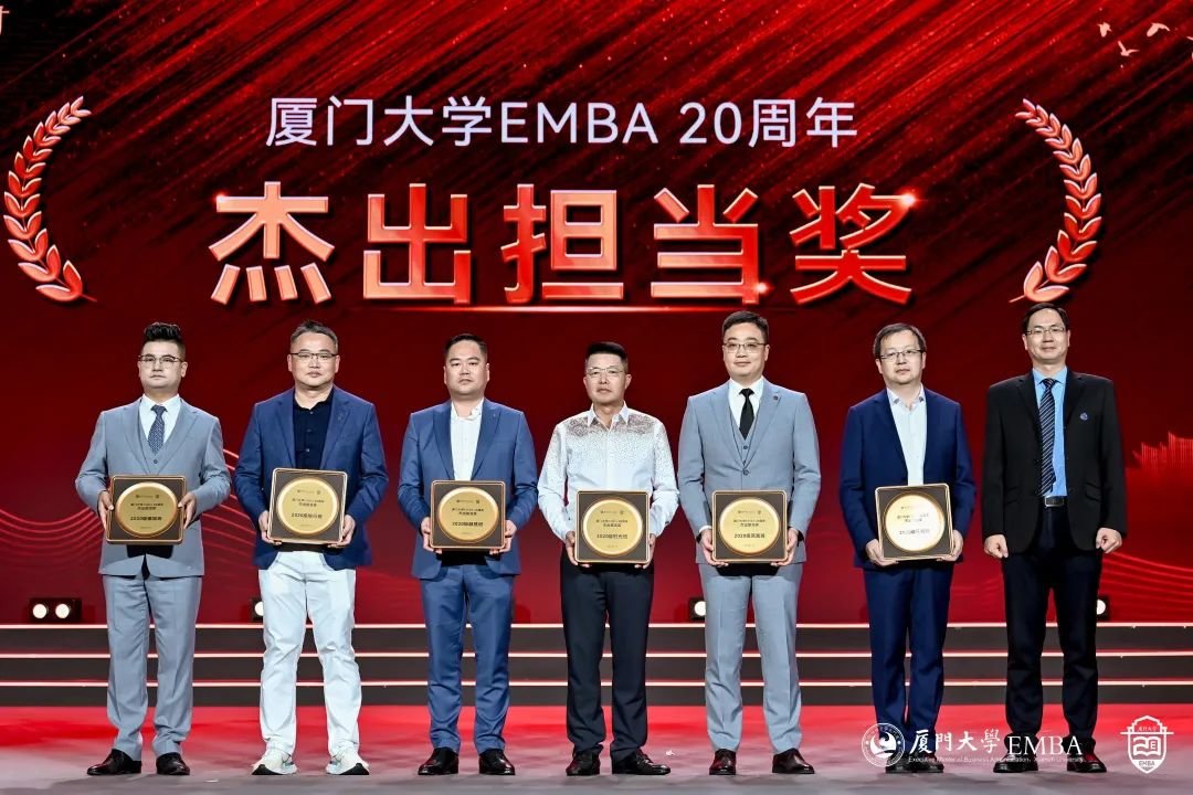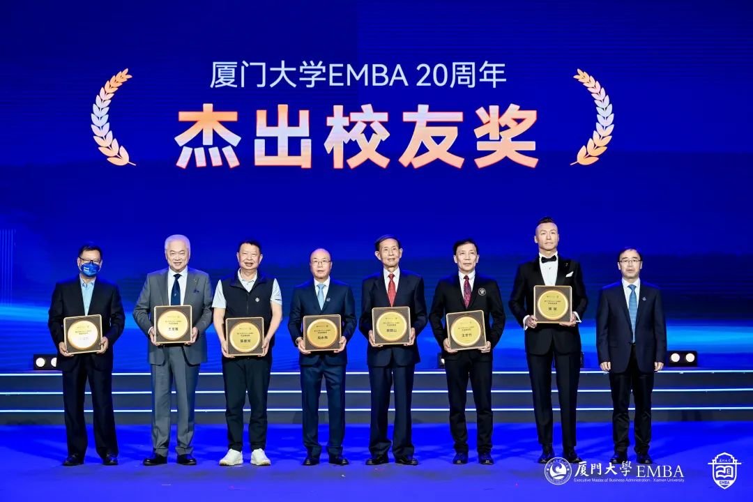 EMBA20年,有大量的校友为社会做出杰出的贡献,获得社会的肯定和认可,荣获众多荣誉。他们踔厉奋发,是时代的追梦人,也是时代的领航人,是众多厦E学子的楷模与榜样。学校为获得过“全国优秀企业家”、“五一劳动奖章”、“全国劳动模范”称号的校友们授予杰出校友奖。张宗益校长为他们颁奖。他们是: 陈景河、 卢金来、 许晓曦、 姚 燕、 赖鞍山、 周永伟、 马洪斌、 丁水波、 丁世忠、 陶以平、 刘迎忠、 张水利、 侯斌、 龚伟、 余枫、 王良、 竺保国、 蔡金鑫、 王龙雏、 李国彪、 周南方、 夏华、 王冬竹。