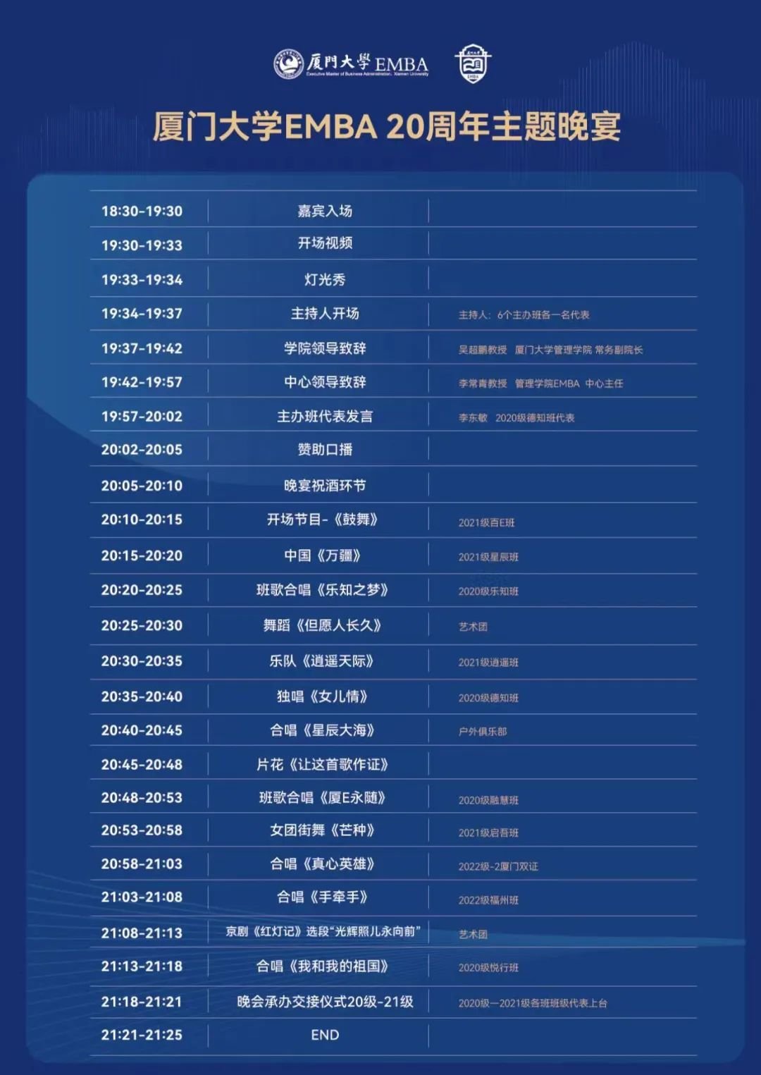 勇于担当、善于担当,是厦门大学EMBA学子的特征。本次厦门大学EMBA20周年发展大会由2020级六个班级共同担当主办,经过近一年的筹备工作,致力办成一届简约、品质、精彩的厦E盛会,以实际行动开启厦门大学EMBA新的征程。