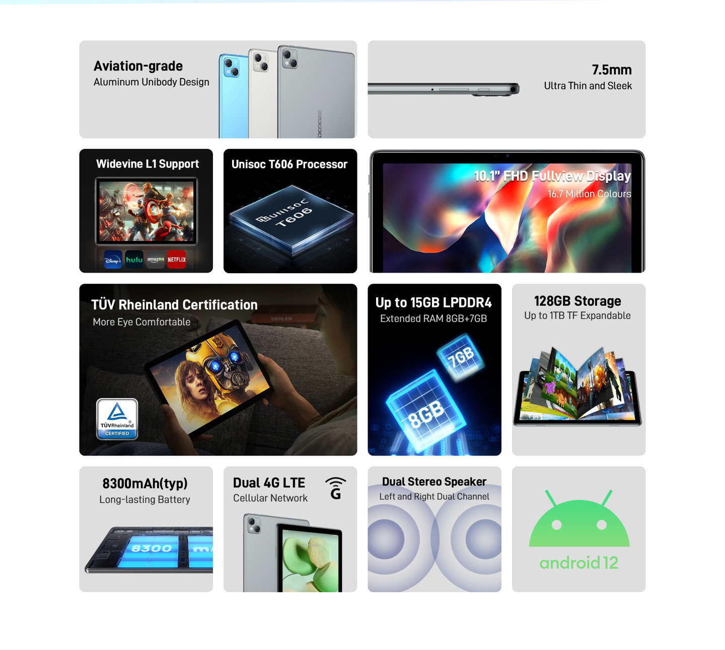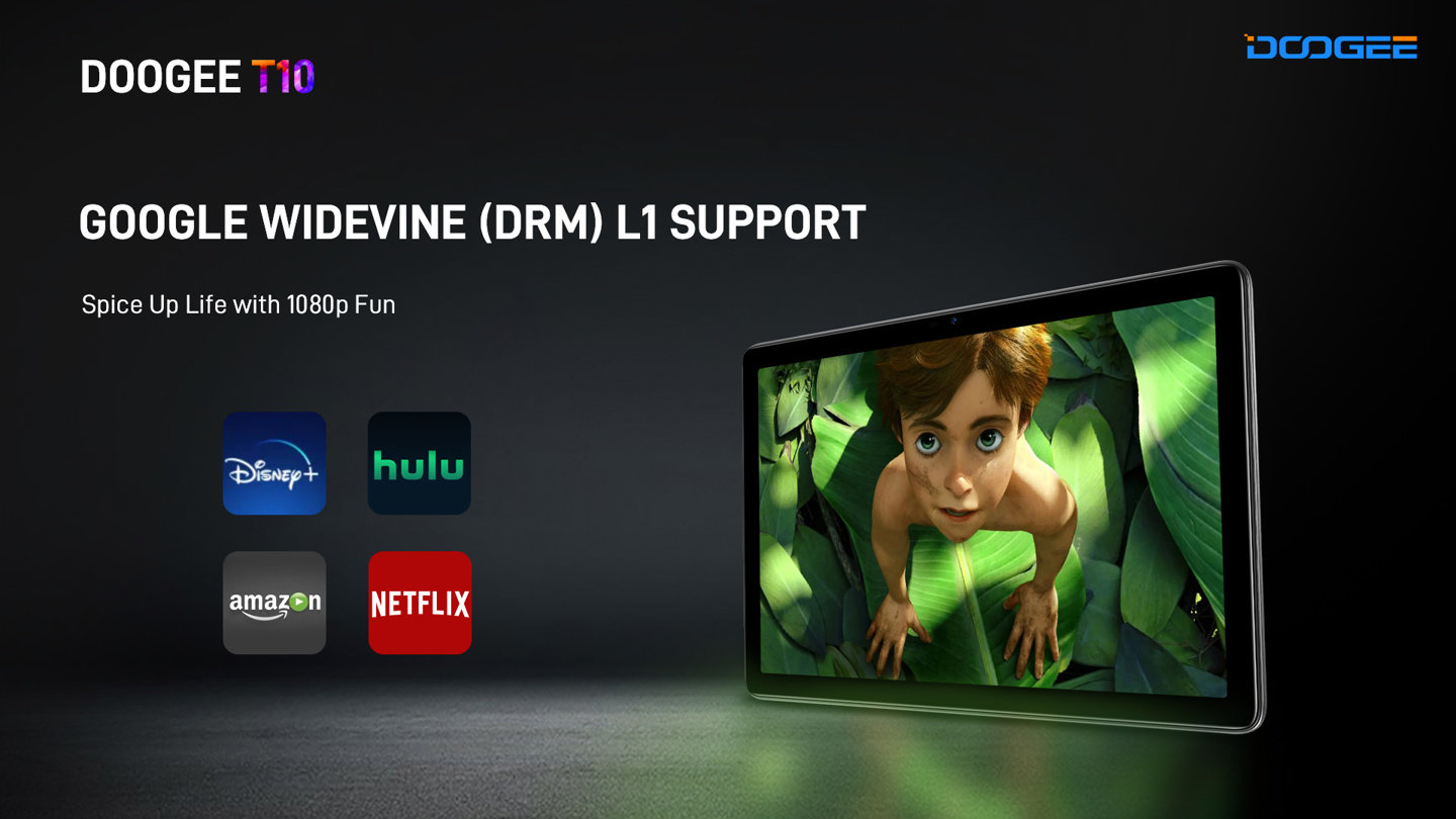 Doogee T10 搭载 10.1 英寸 1920 x 1200 像素的“全视野”IPS LCD 显示屏,具有 300 尼特亮度,有 TÜV 莱茵护眼认证。该机采用航空级铝制一体机身,厚度为 7.5 毫米,总重量为 430 克。