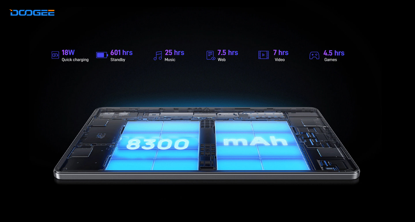 Doogee T10 搭载紫光展锐 T606 芯片,以及 8GB LPDDR4 内存,支持 5GB 虚拟内存。还有 128GB UFS 存储,可通过 microSD 扩展到 1TB。该机拥有 8300mAh 电池,支持 Type-C 口 18W 充电。