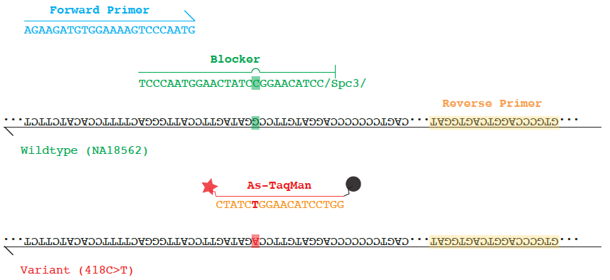 图1. 检测IDH2 418C>T突变的As-BDA序列设计举例