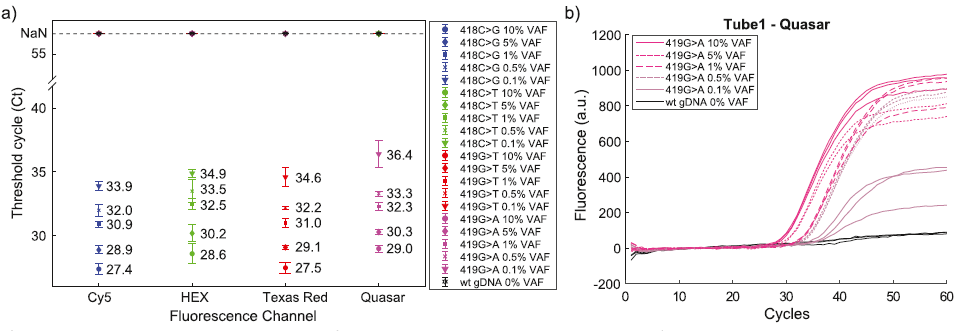 随后,研究团队设计了多重As-BDA方法用于检测急性髓性白血病(AML)中最常见的IDH2突变(包括4种R140和6种R172),12种突变型连同内参一共分为三管,每管占用4个荧光通道。对于所有突变,使用15ng的gDNA模拟标准品依然可以稳定检出0.1% VAF的阳性样本,并且同一管中仅有对应探针产生的信号,并未出现其他荧光通道的干扰现象,WT的扩增曲线也几乎没有起峰,足见多重As-BDA在这个灵敏度下依然可以做到100%的特异性(图3)。