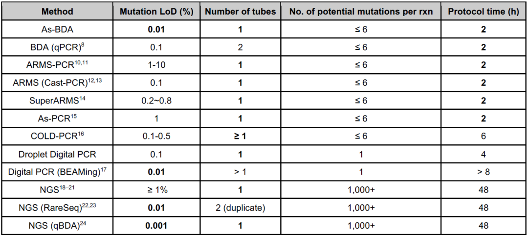总之,As-BDA技术将稀有突变富集和荧光定量PCR融为一体,通过单次反应实现超低频变异(SNV和INDELs)的多重检测。这种结合给分子诊断和基因组学研究带来至少两方面的实际优势:同时定性和定量地检测突变,并实现更快速的流程时间,从而可以在2小时内完成实验并给出结果,这是其他超低频变异检测技术,如ddPCR、NGS以及其他BDA方法难以实现的。研究人员通过人工合成DNA、商业标准品以及临床样本进行了大量实验,证明As-BDA能对15ng input中低至4个拷贝的变异分子进行准确定量,中位误差仅为9.1%,在更大样本量下LoD可进一步提升至0.01% VAF。15ng的起始量要求可以适用于液体活检在内的大多数临床检测场景。尽管As-BDA的定量能力与ddPCR旗鼓相当,但前者对设备的要求更低,多重设计更加灵活,对input最大投入量也没有严格限制。