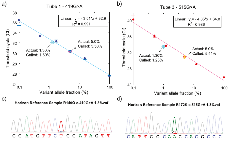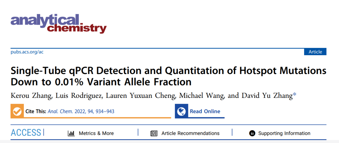 基因的低频变异检测是指从大量野生型DNA背景下检测少量具有生物学意义的突变序列,在肿瘤、遗传、感染等领域都有重要应用价值,其中突变序列的占比称为变异等位基因频率(VAF)。现有检测技术在便捷性、检测通量和检测下限(LoD)等方面各有所长,但基于qPCR的超低频变异检测方法仍鲜有报道。阅尔基因独有的抑制探针置换扩增(BDA)技术目前已经在Sanger、NGS、三代测序等下游技术平台实现不同场景下LoD的突破。2022年1月,阅尔基因的科学家在分析化学顶刊Analytical Chemistry上发表研究成果,整合BDA和探针法qPCR(AS-TaqMan)开发出新一代超高灵敏度变异检测技术——As-BDA,通过单管单次反应的多重qPCR即可完成低至0.01% VAF变异的检出。