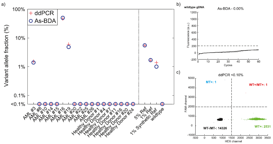 那么As-BDA在真实样本中的表现如何?首先,研究团队使用人工合成样本绘制了各个突变位点的qPCR标准曲线用于绝对定量,随后检测两个不同VAF的商业化标准品,比较测量值和实际值的结果发现,两者之间的误差介于3.8~30%之间(图4)。进一步,利用11个AML临床样本、7个健康对照以及若干标准品对照,研究人员比较了As-BDA和ddPCR在实际样本中的定量表现。数据显示,两者的结果高度一致(图5)。另外,对一个阴性AML样本和健康对照分别进行9次重复实验发现,As-BDA结果全部为阴性,而ddPCR在0.1% VAF水平出现了数次假阳性结果。最后,研究人员还在肾癌患者FFPE和cfDNA样本中进行了测试,成功检出DNMT3A R882H突变且得出的VAF与使用NGS方法测得的相一致。