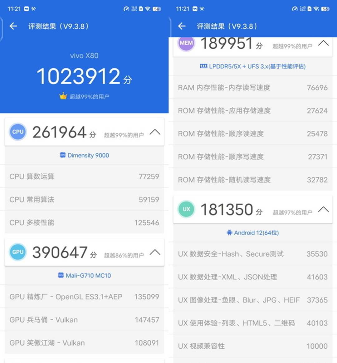 将其与前代天玑9000代表机型vivo X80进行对比就会发现,GPU与存储部分是进步最大的子项目,特别是GPU重负载下的提升甚至达到了30%左右的惊人水平。而在存储部分,虽然X90的内存读写速度并没有明显上涨,但闪存的顺序读写则几乎涨了一倍。