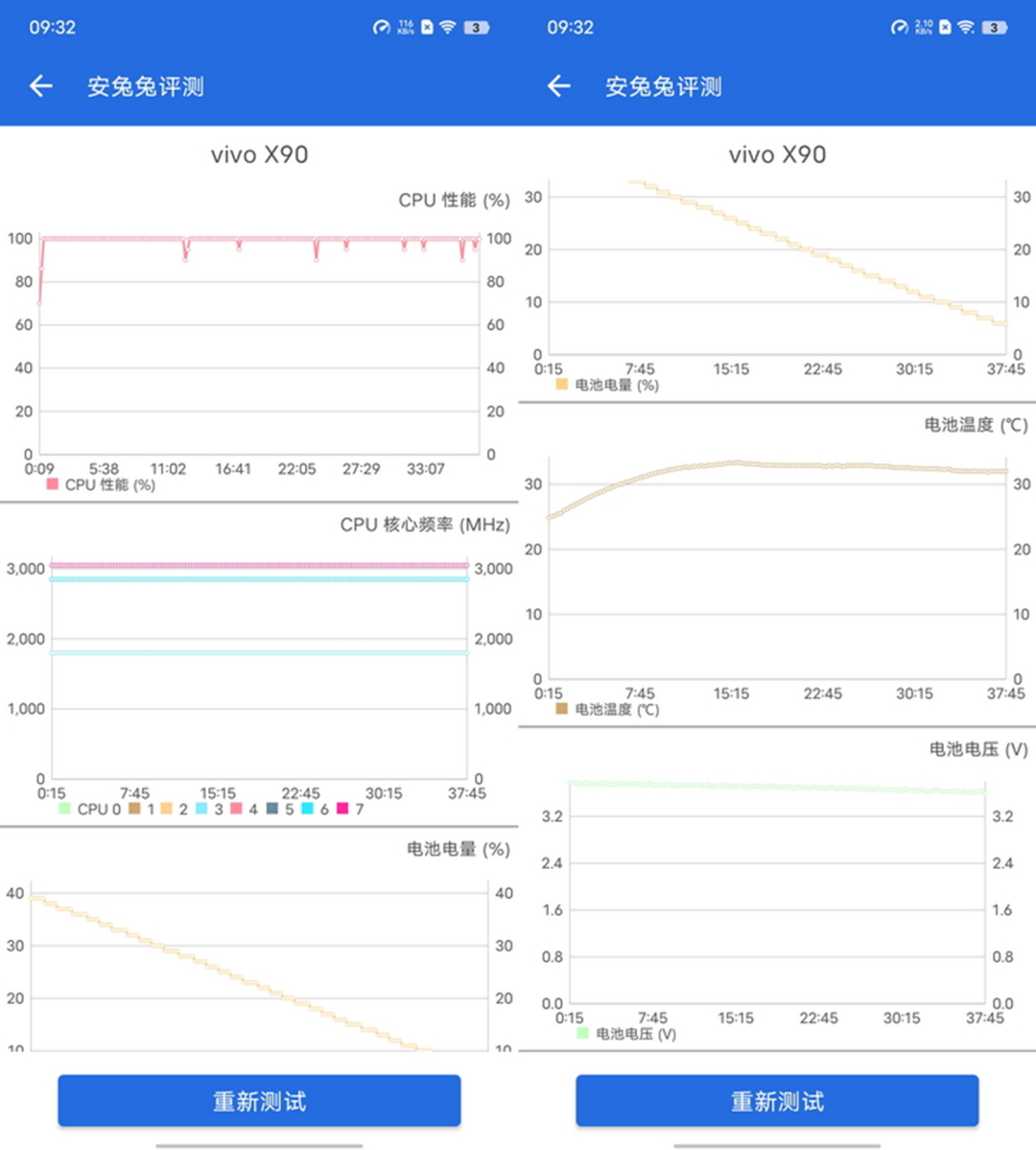 最后,我们也测试了vivo X90重负载下的性能释放。可以看到,它具备相当不错的持续高性能释放能力,即便是在长时间满载的情况下,CPU依然可以做到持续不降频、不“掉线”,一直维持在满功率和性能输出的水平。