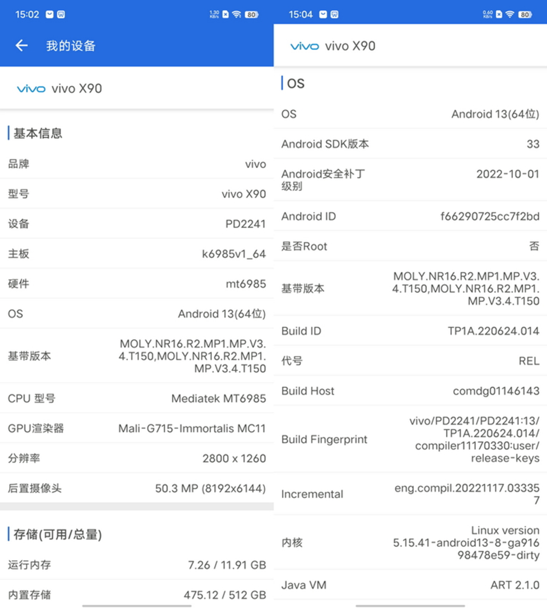 首先,从安兔兔评测的系统信息中可以看到,X90搭载的是联发科MT6985平台,以及12GB+512GB的存储组合,并配备了基于Android 13的操作系统。