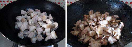 5、另起锅,注入油,放入焯水沥干水分的猪肉。