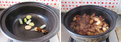 9、把葱姜 八角 辣椒放在砂锅的底部。