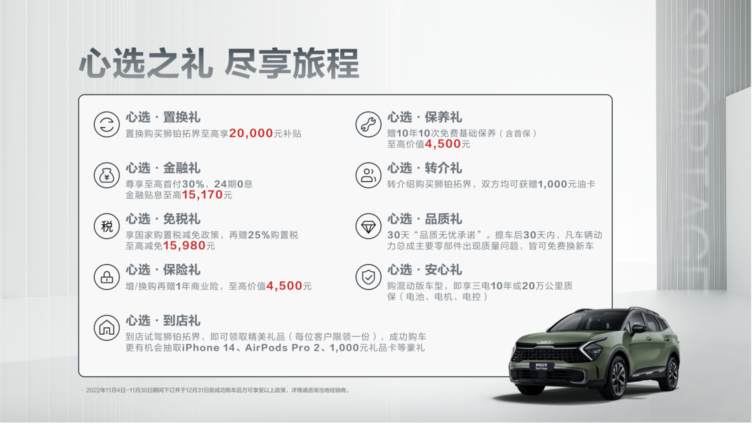 一般来说,车型第一年的保险最贵,而像20万级别的车型,基本第一年六七千块钱的保险费用是起码的。狮铂拓界的“保险礼”,是给增换购的客户,提供最高4500元的1年商业险。也就是说,除了车船税和交强险之外,第一年的商业险,基本起亚都给包了。