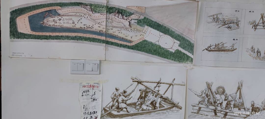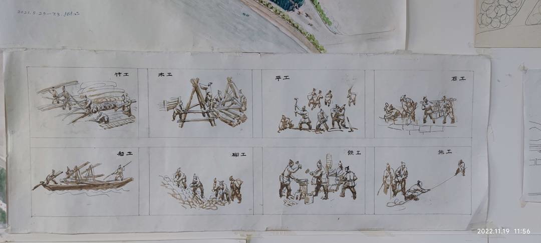 在《堰工颂》沙盘模型周围的墙壁上,密密麻麻地贴着张宗品对这件作品的设计草图和初稿,包括八大工种雕塑的素描小样,他说:“我到这个岁数了第一次搞雕塑,是因为只有三维立体的雕塑景观才能把李冰建堰的场景真实还原,表达地生灵活现。”