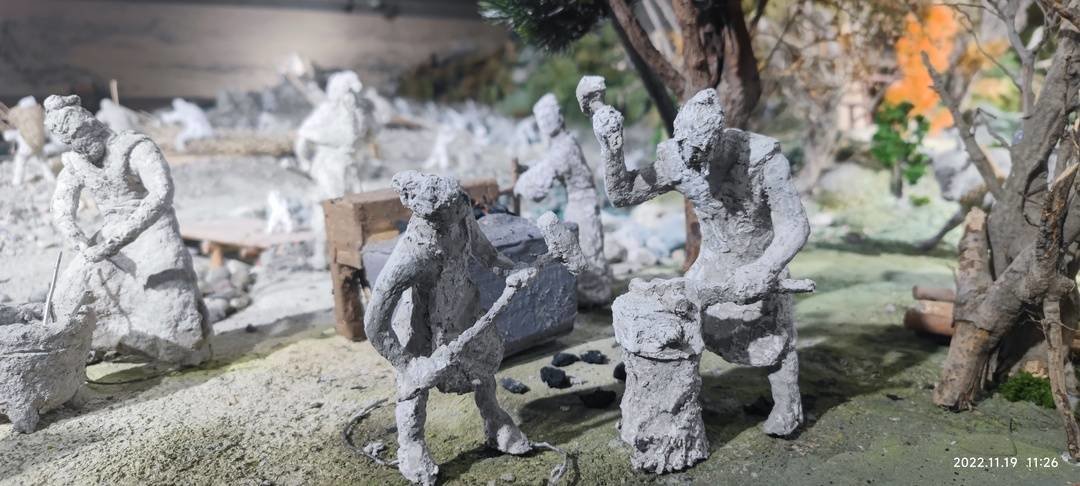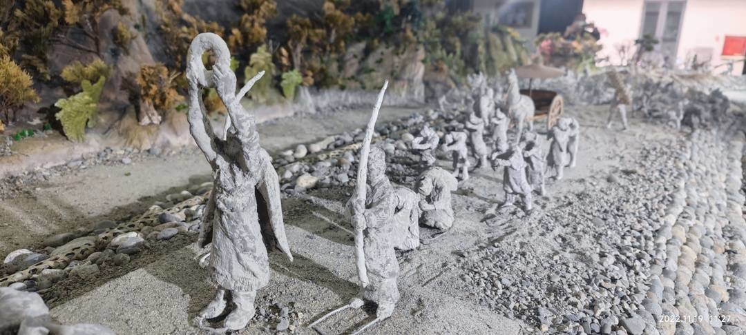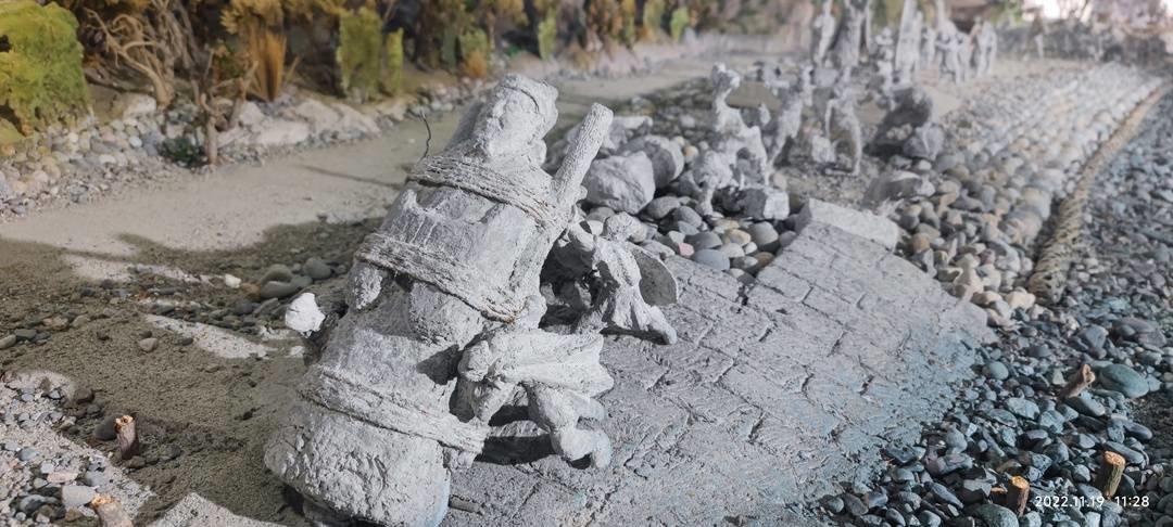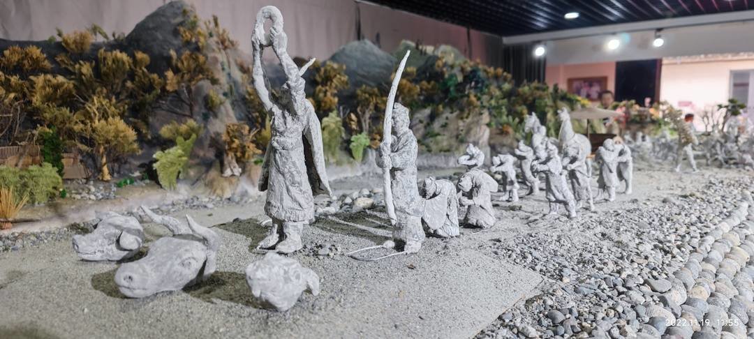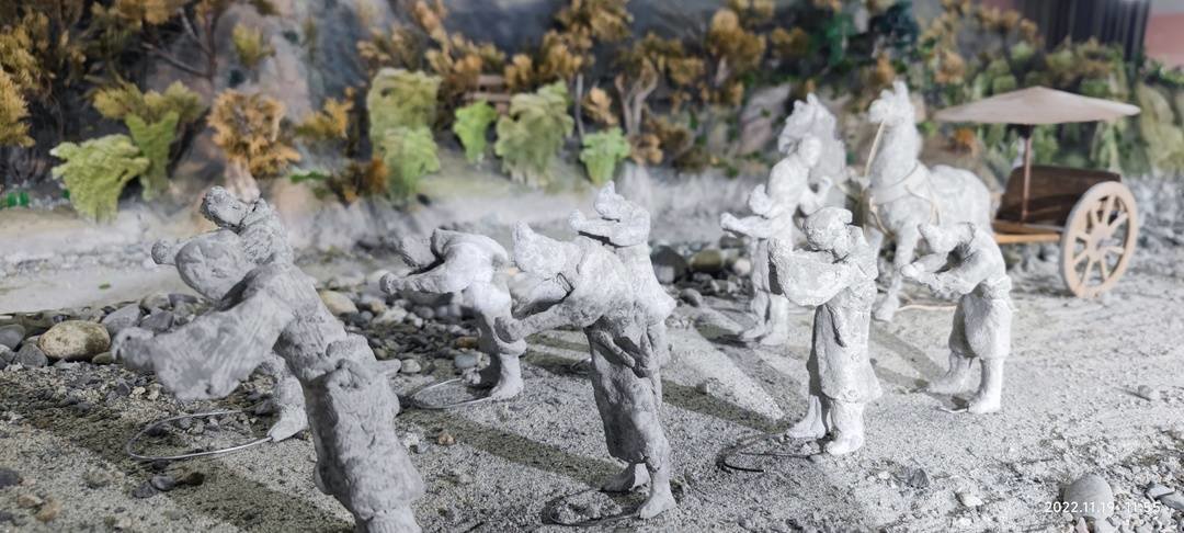 沙盘中出现的140余个人物雕塑呈灰白颜色,看上去颇像出土的陶俑,充满历史沧桑。据张宗品介绍,它们都是他用纸浆捏制而成。“我得到了很多朋友与志愿者的帮助,都江堰市委宣传部和市政协等单位给予大力支持,他们给我送来的旧报纸、废纸箱超过千斤,然后我把这些纸材打成纸浆,然后兑胶水来做成雕塑。”