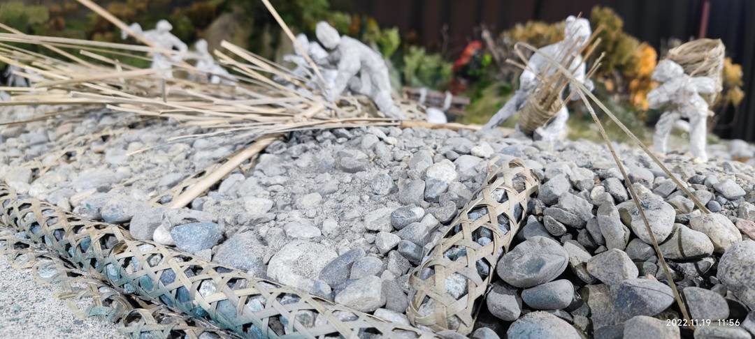 堰工们脚下的鹅卵石密密麻麻,20多平米的沙盘用去了好几吨重的砂石,这些也是张宗品的好友和志愿者从都江堰的河滩上辛辛苦苦采集背运回来的。“本来我是要自己去淘石头的,可我的好哥们儿却拉住我不让去,说我年纪大了,这些体力活儿就交给他们吧。”张宗品的弟弟来自农村,心灵手巧的他擅长竹艺加工,于是还原治水竹笼的重任就交给了他。记者看到堤坝上那些按比例缩小,盛装着鹅卵石的竹笼做得真是惟妙惟肖。