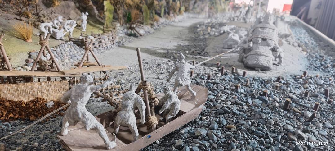 在都江堰古城景区的堰工文化馆,当一道灰色的幕布缓缓拉开,映入记者眼帘的是一个10米长的大沙盘,在这个都江堰微缩景观中,鱼嘴、飞沙堰、宝瓶口、虎头岩悉数显现。堤坝上,140多个秦汉时代的堰工雕塑分布其间。他们肌肉健硕,挥舞着各种工具在大堤上忙碌着。每个人物身高15厘米,无论是神情还是动作都栩栩如生。