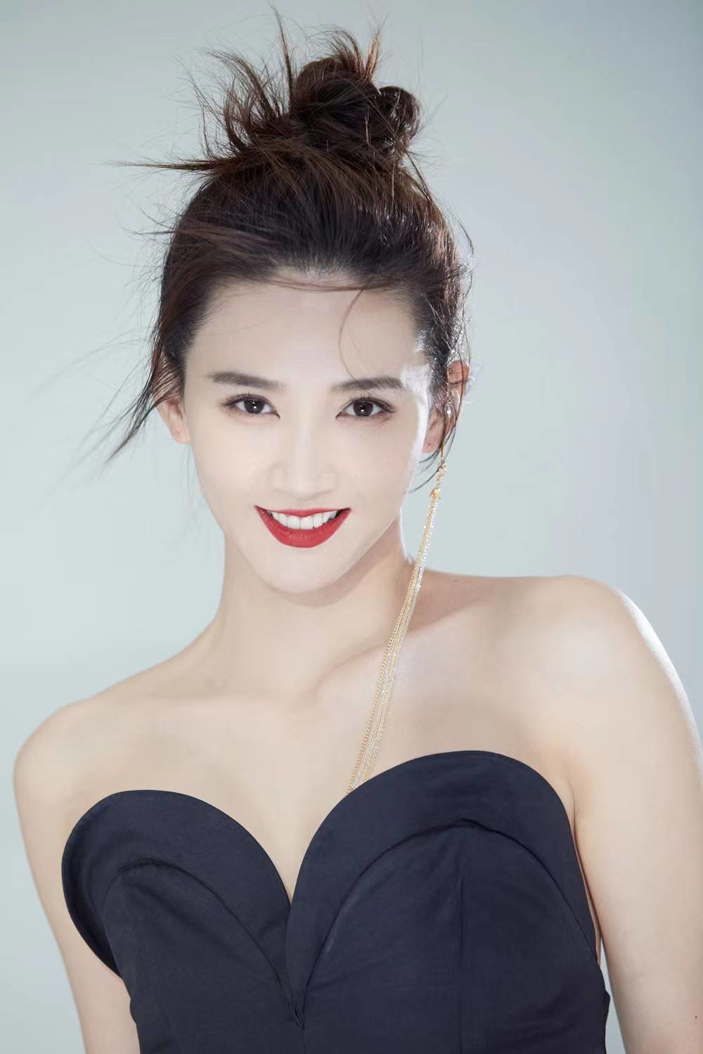 额前的碎发随着周开开的动作不停舞动着,给整体氛围增添了一丝俏皮感,一边的耳饰也随性地垂在脖颈之间,优雅不失性感。