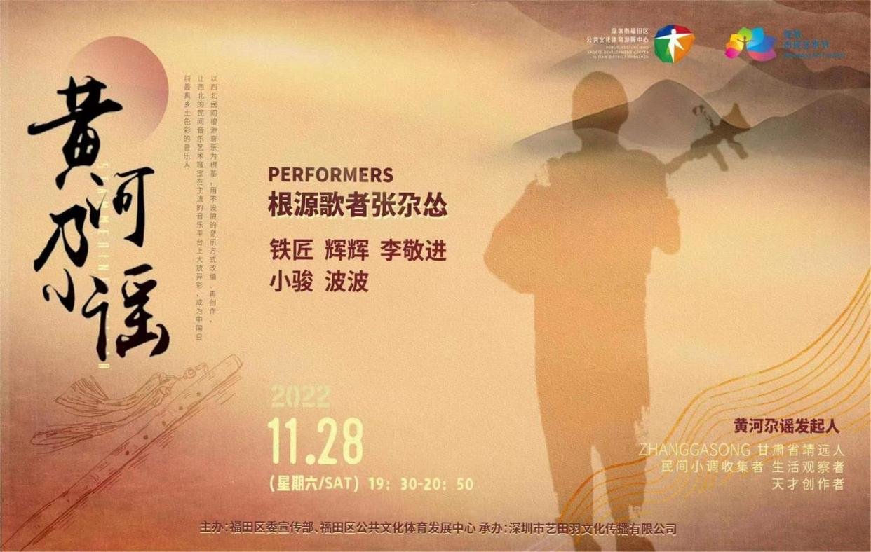 2022年11月28日晚,大家期待已久的西北民乐风终于吹到深圳福田,由深圳福田区委宣传部、深圳市福田区公共文化体育发展中心主办,深圳市艺田羽文化传播有限公司承办,邀请西北根源歌者,知名音乐人张尕怂携《黄河尕谣》亮相绽放2022深圳福田市民艺术节。