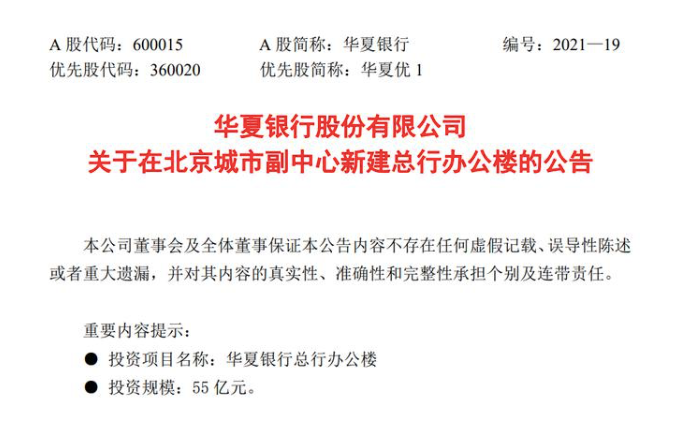 2021年4月,华夏银行曾对外公告,“公司拟在城市副中心购地建楼,建设总行办公楼,以更好地贯彻落实国家京津冀协同发展战略,支持北京‘四个中心’建设和城市副中心发展。”