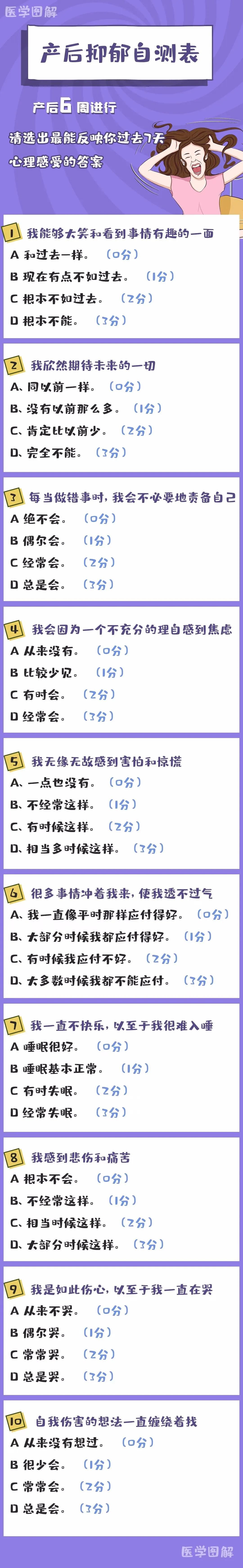 如果你想了解自己是否存在产后抑郁,可以用「爱丁堡产后抑郁评分表」来评估。