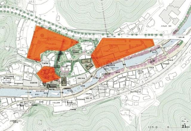 长门温泉街开发计划:图中只有橙色部分是长门市买下的土地,中间的部分征用了居民的私有地。私有地的所有者正好也是在当地经营旅馆的人,他们都希望温泉街能再次复活。在星野集团的沟通和交涉下,居民最终将自己的土地卖给了长门市。