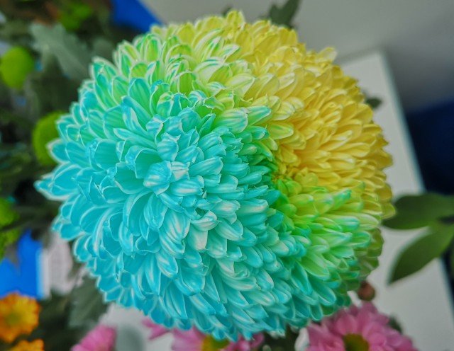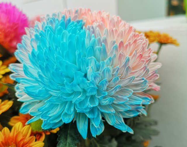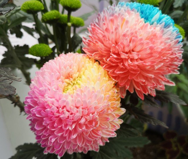 近些年来七彩菊吸引了大众的目光,“七彩菊”并不是花朵染色而成,而是园艺师采用生物炫彩素,通过控制温度、水分、光照、PH等因素,使菊花根部对色素进行吸收,将多种色彩均匀地呈现在花瓣上。