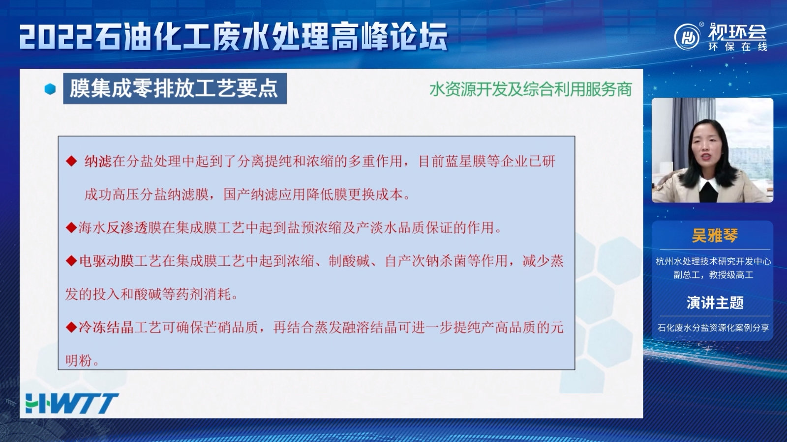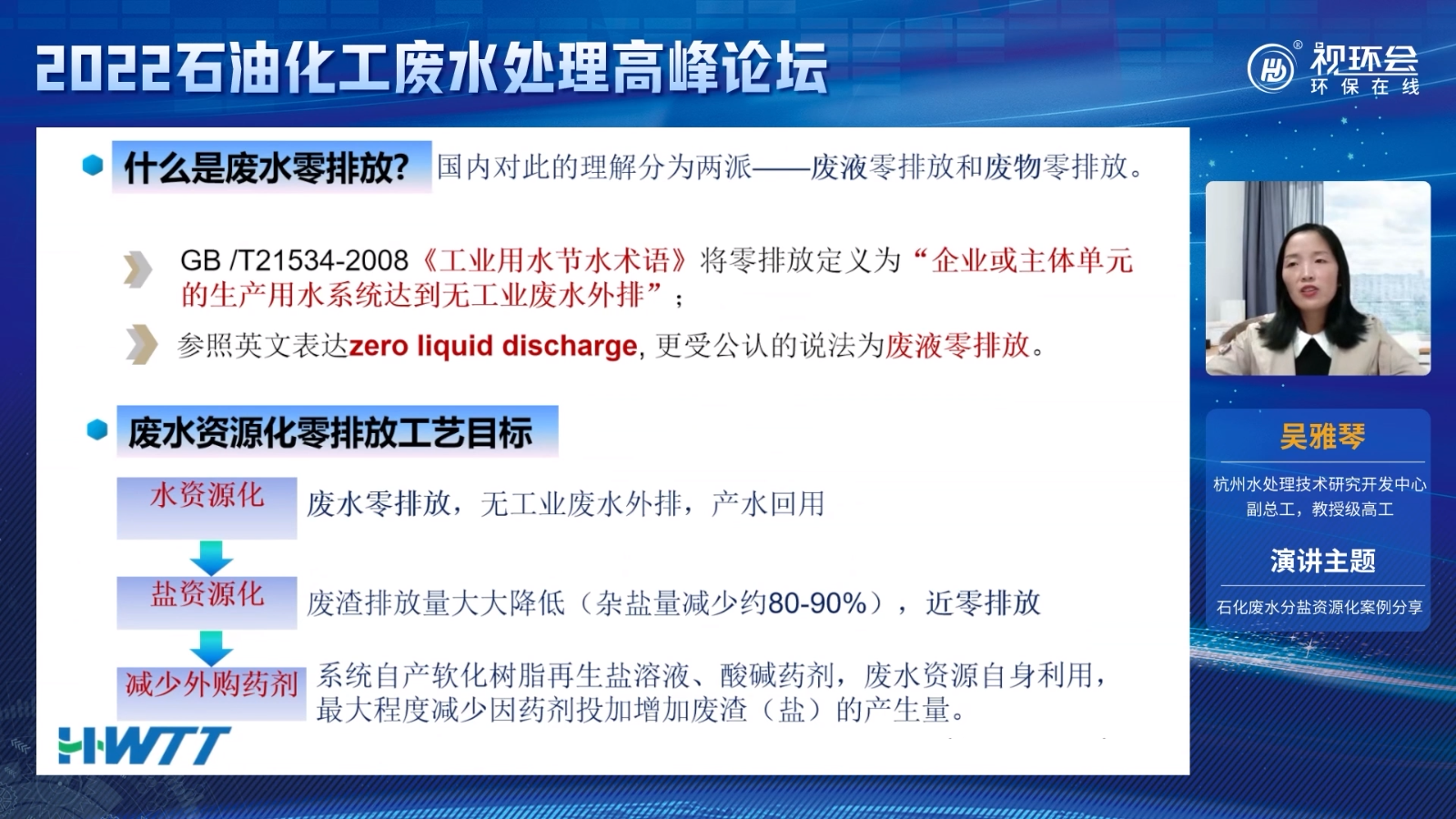 “事实上,工业废水完全零排放在现阶段并不现实,因此我们常说的废水零排放一般是指废液零排放。污泥、废渣等固废排放难以避免,只能通过工艺优化等手段实现减量化。”本届视环会2022石油化工废水处理高峰论坛上,杭州水处理中心副总工、教授级高工吴雅琴开篇明义,指明废水资源化零排放应聚焦:水资源、盐资源化以及减少外购药剂。尤其是废水中的盐,经过浓缩、分盐等可得到工业盐进行回收再利用,高效的工艺可减少约80%-90%杂盐量。
