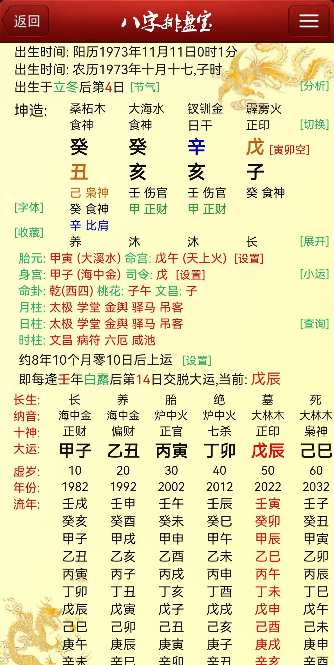 四,地支亥子丑水局,水有点太旺,要用阳制,观行运约在45岁之后的运相对较好,直到晚年都是不错的,若个别流年不利,只是暂时的,不必顾虑。