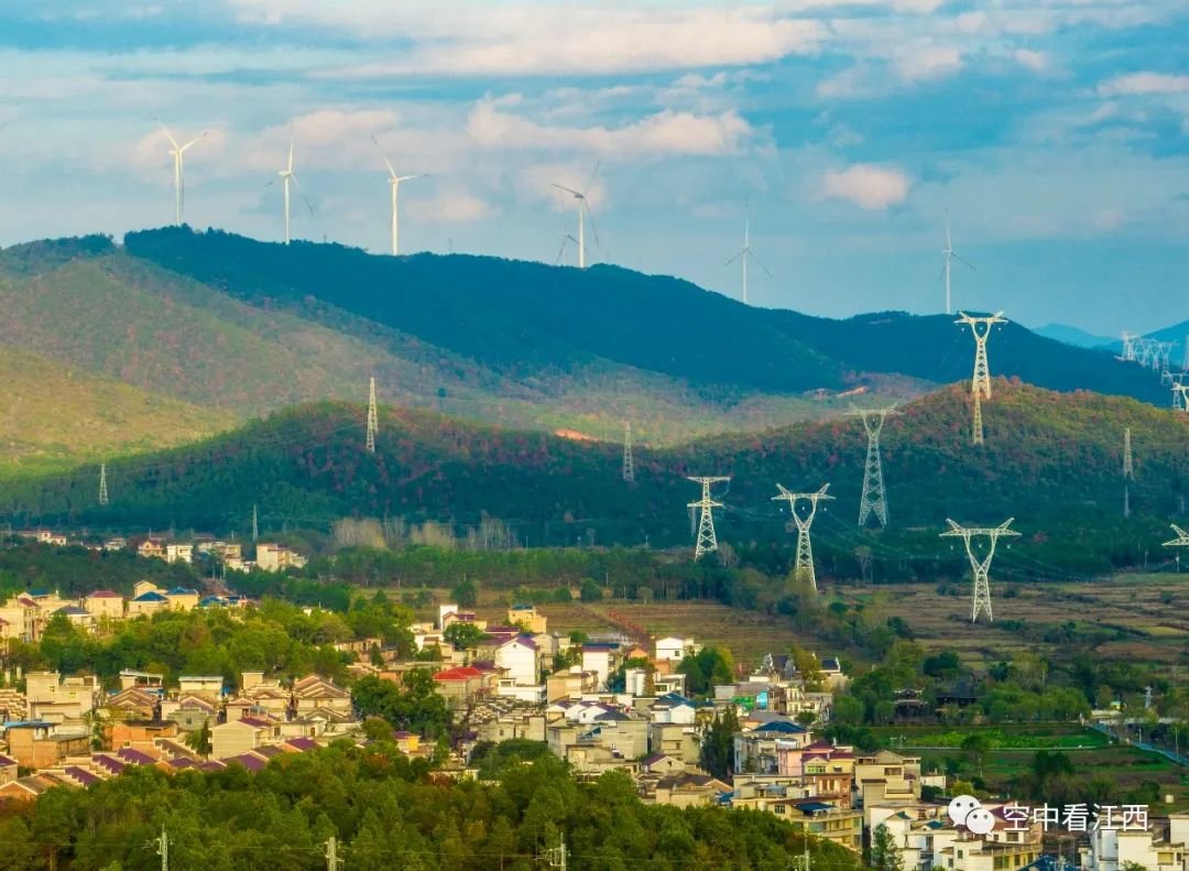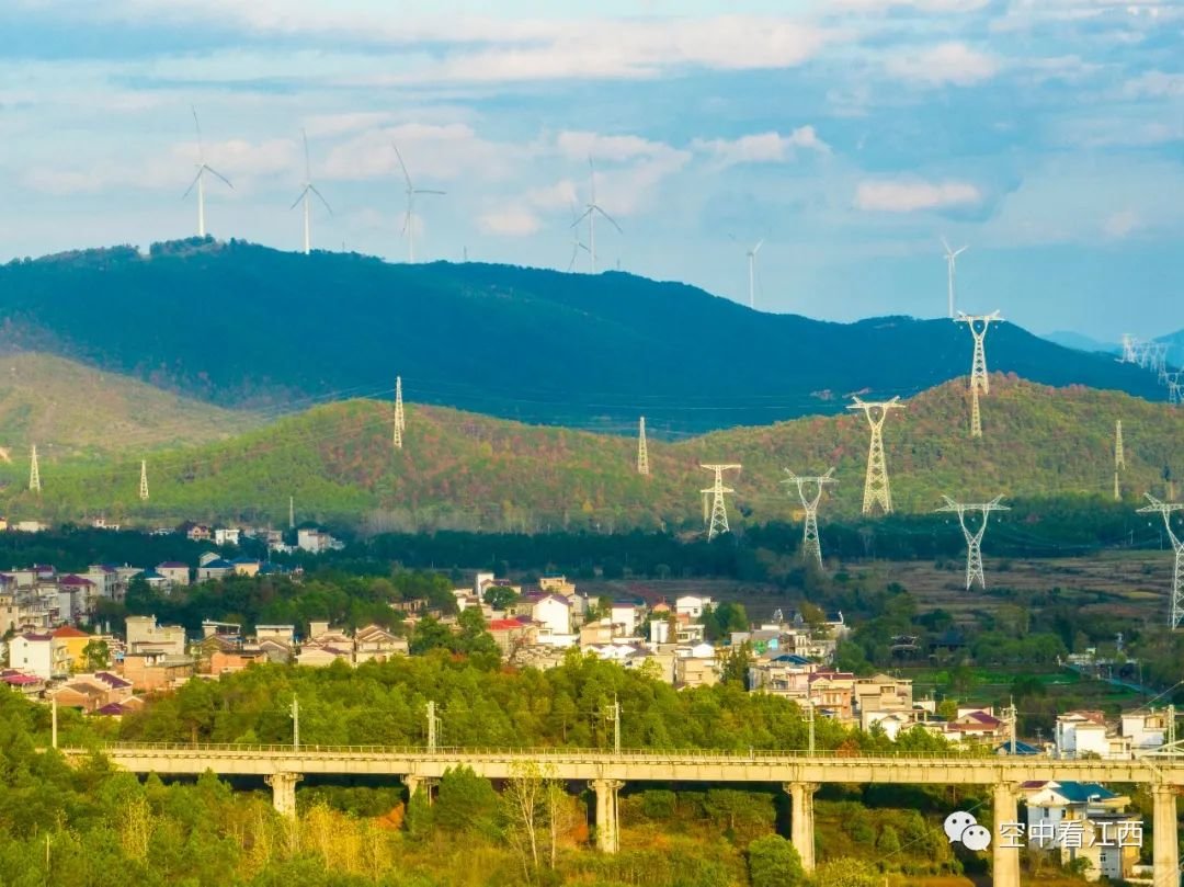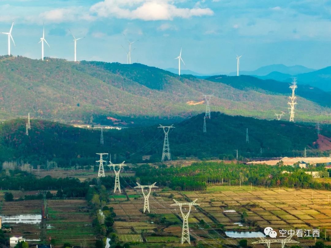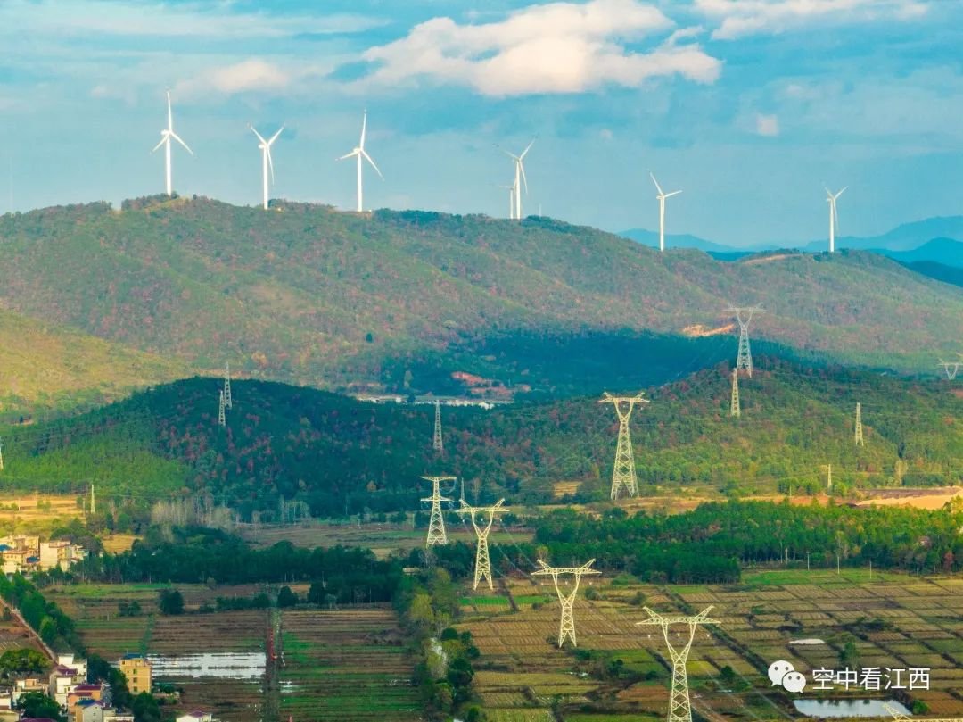 11月28日,航拍江西吉安吉水县黄桥镇,只见蓝天白云之下阳光洒向大地,一台台风力发电机组与一座座特高压基塔交相辉映,蔚为壮观。