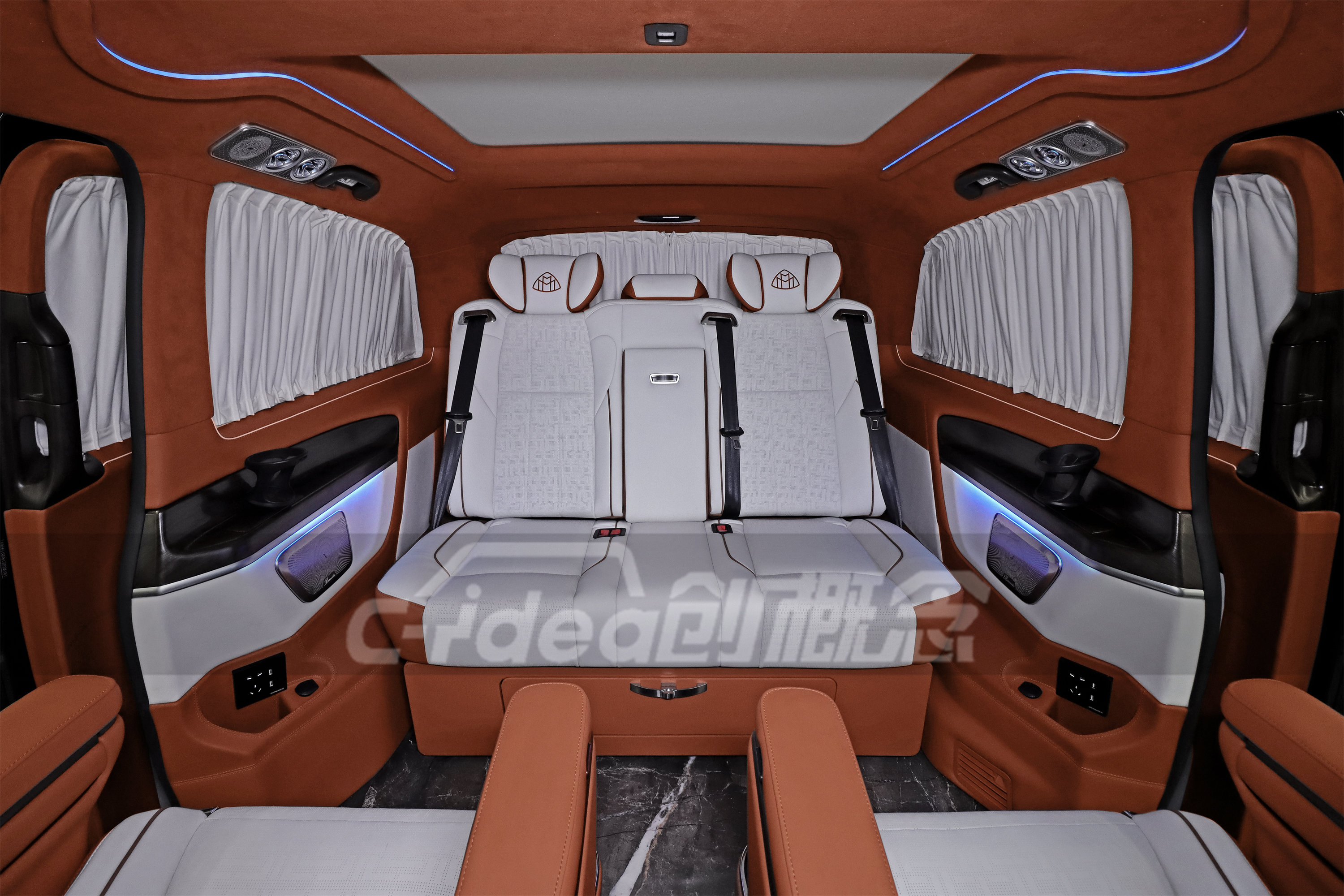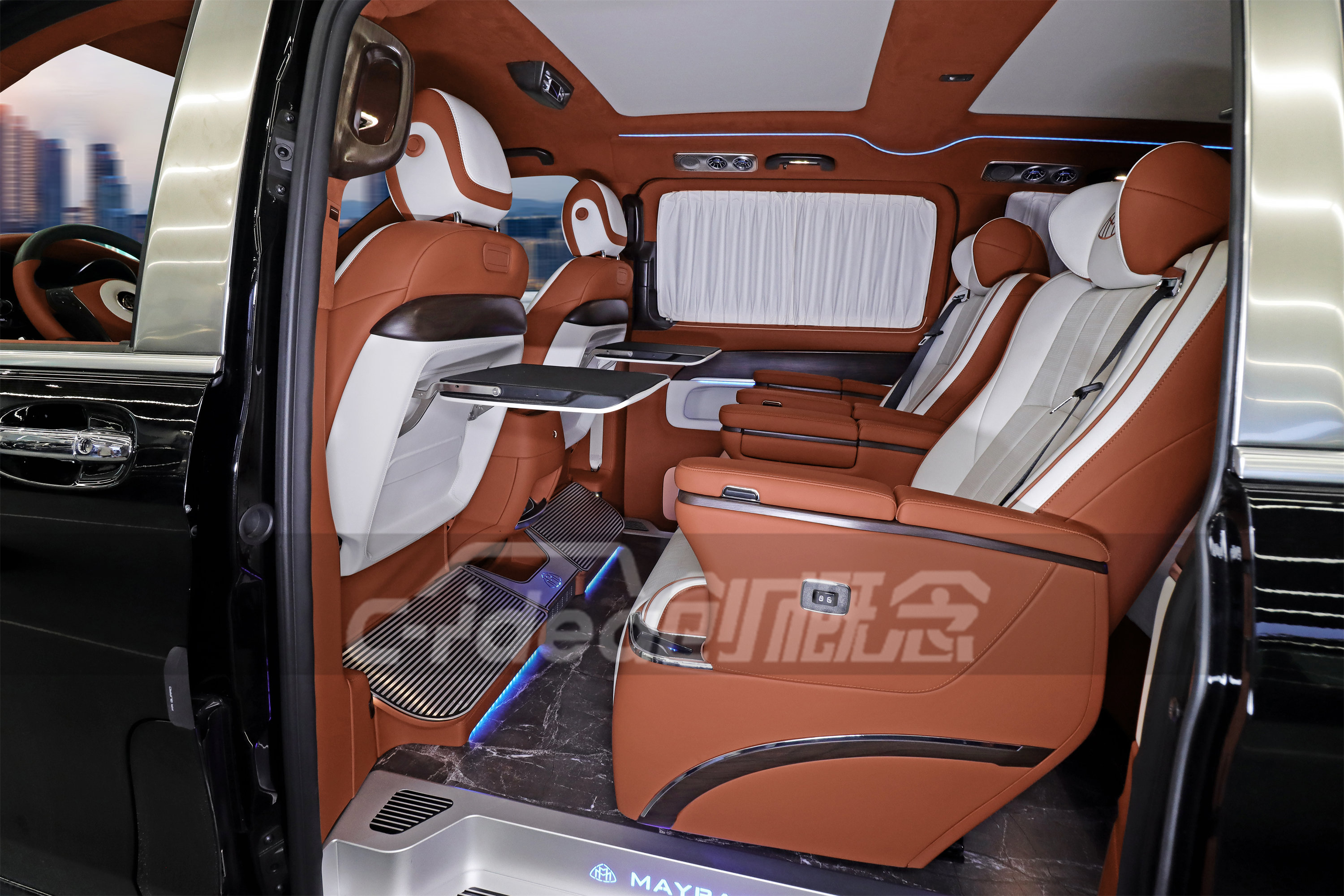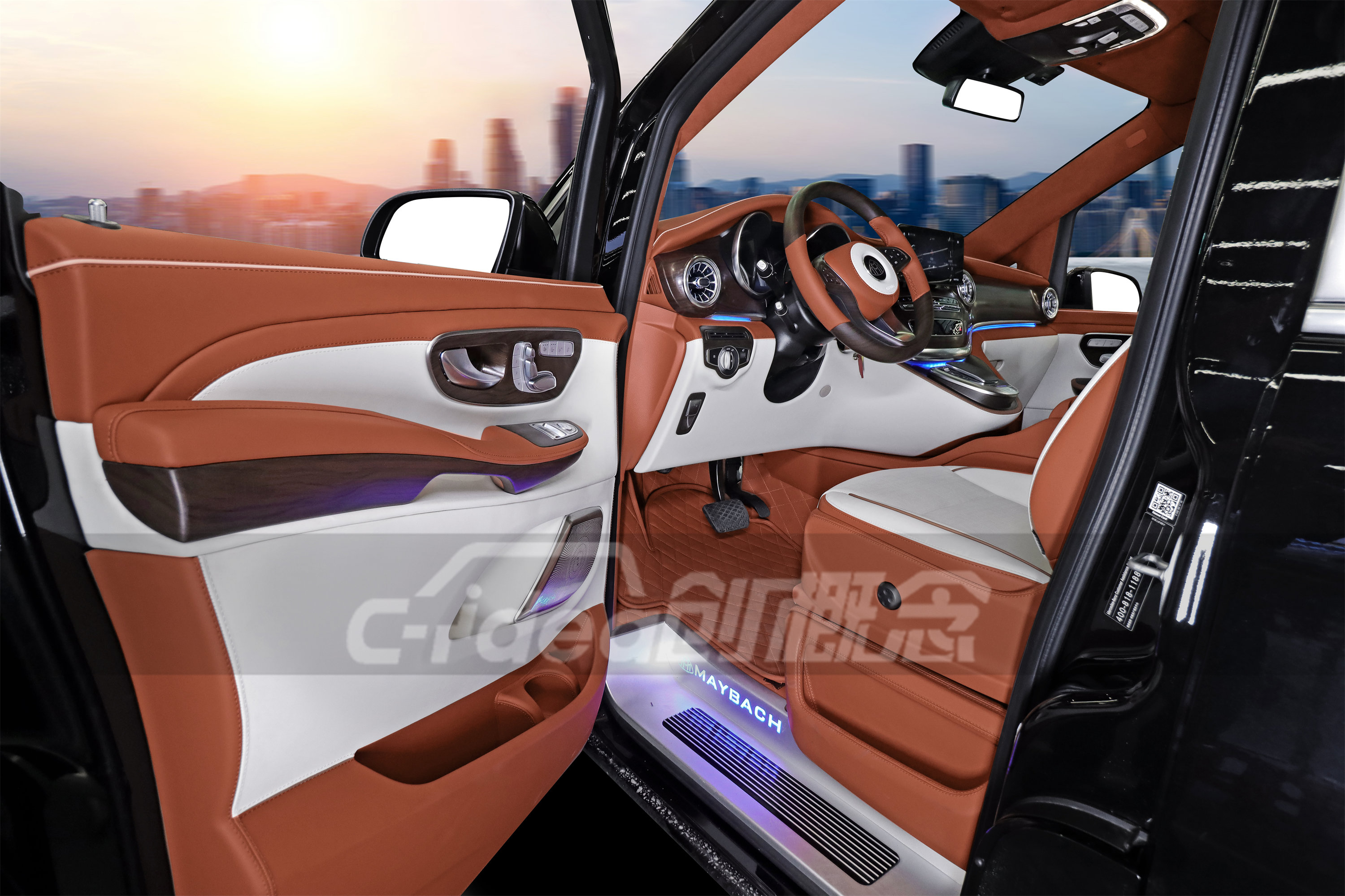 门板处也是采用了纳帕皮包覆,拉手位置定制采用豪华桃木装饰,内饰细节更是能见证品质,独具匠心的设计。脚踏板的位置换掉原本的塑料配件升级为带氛围灯,还带有奔驰LOGO的全铝合金迎宾踏板,这样更显档次。